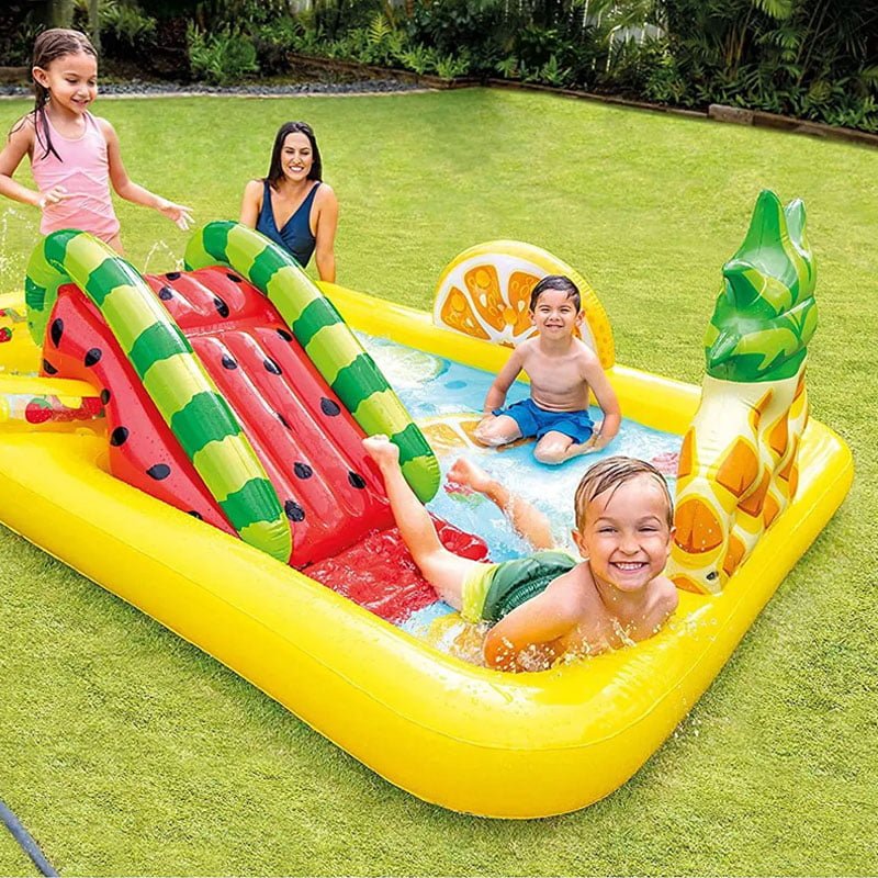 Keep your kids cool this summer with the Intex Jungle Adventure Play Center. Featuring two pools, this play center offers endless fun as kids slide, splash, and play with the inflatable pineapple, orange, and strawberry.